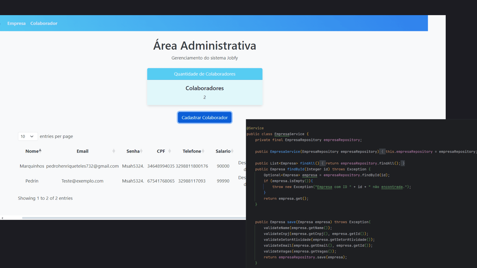 Jobfy é um sistema composto por frontend e backend, desenvolvido para gerenciar funcionários e empresas. O backend foi construído utilizando Java e Spring Boot, enquanto o frontend foi desenvolvido com HTML5, CSS3 (Bootstrap) e JavaScript (jQuery, DataTables). O sistema permite o cadastro, edição, exclusão e listagem de dados, facilitando a administração de recursos humanos e operações corporativas. É ideal para organizações que buscam uma gestão eficiente de funcionários e empresas. Para utilizá-lo, é necessário clonar o repositório do backend e configurá-lo conforme as instruções.